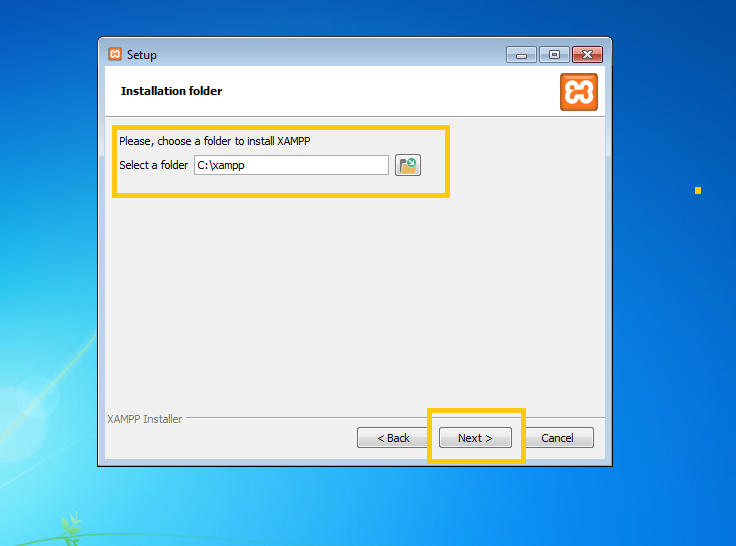 5. XAMPP le pedirá que elija un folder de instalación. Lo que yo recomiendo es dejar el que trae por defecto, y luego de click en "Next" para continuar: